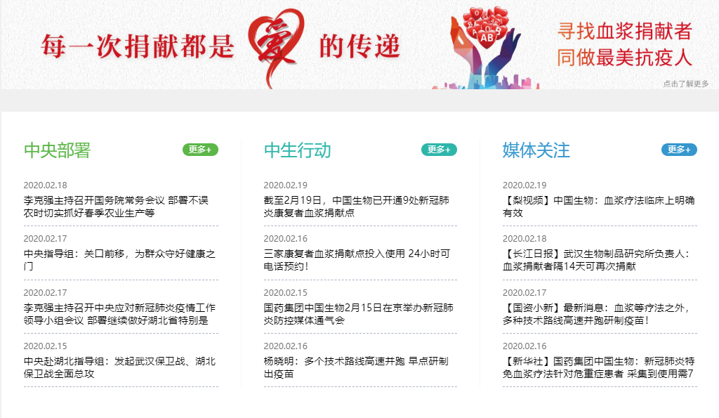 新鸿儒为中国生物所制作的专题栏目,首先,响应国家中央部署,承担央企使命,第一时间更新中央下达意见;第二,在中国生物的研究下,捐献血浆成为重中之重,号召与查询入口需鲜明可见;第三,防疫知识,是大众最关心的部分,足够专业贴心的防疫知识,可稳定人心;最后,群众关注、媒体关注的进程动态实时更新。