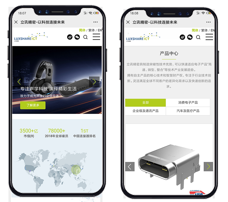 因此作为中国互联网资深服务商,新鸿儒为立讯精密提供官网建设及维护,在提升整体品牌形象的同时,更帮助立讯规划准确定位网站目标群体,设定网站整体架构,规划、设计网站栏目及其内容,制定网站开发流程及顺序,提供数字品牌建设整体解决方案,以同时适应PC端,手机端的呈现方式,最大限度地进行高效资源分配与管理的设计。