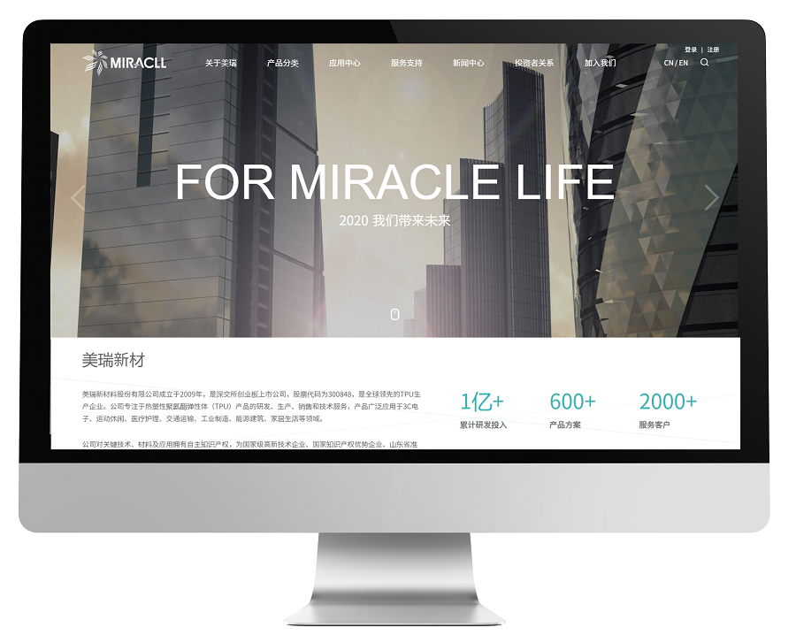 美瑞新材料对关键技术、材料及应用拥有自主知识产权,为国家级高新技术企业、国家知识产权优势企业、山东省准独角兽企业、山东省瞪羚示范企业。公司始终坚持以客户满意和为客户创造价值为导向,践行专业、可靠、创新、合作、环保的经营理念,为客户提供高效、低成本的差异化产品解决方案,在向客户提供高性能TPU产品的同时,也为其提供个性化、专业化的技术服务,满足其定制化需求。本次网站的全新搭建,使美瑞新材料在互联网领域展现出全新的品牌形象。