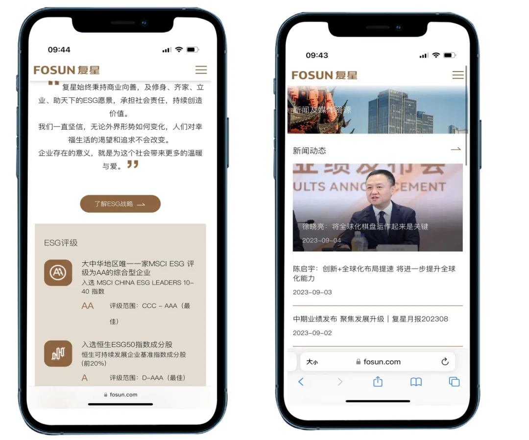 一个优秀的网站离不开优秀的网站结构,网站结构就像一本书的目录一样,网站结构优化会很大提升用户的阅读欲望。而复星集团新官网框架栏目遵循我们是谁-我们做什么-企业发展的可持续性(ESG)-我们的投资-发生的故事及媒体资源-人才发展的叙事方式。除此之外,网站采用响应式技术,满足PC端、手机端、paid端多终端适配,符合当代移动互联网用户使用体验。