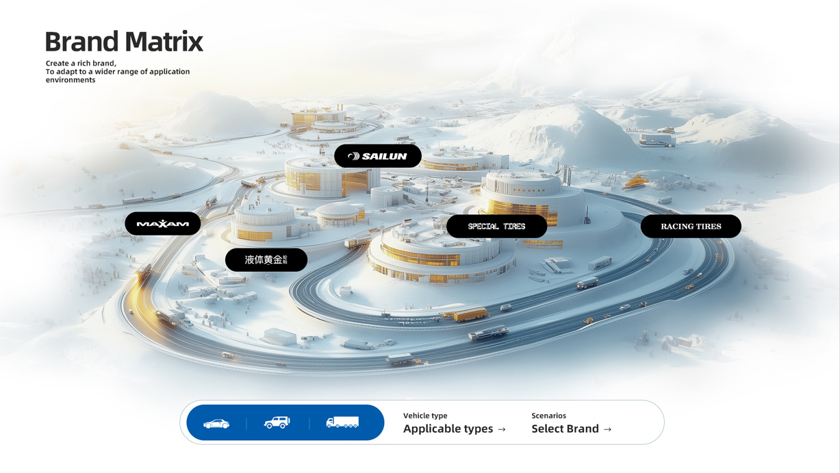 图标 hover 时放大并显示品牌简介,下方设置 “车辆类型 / 应用行业筛选器”,