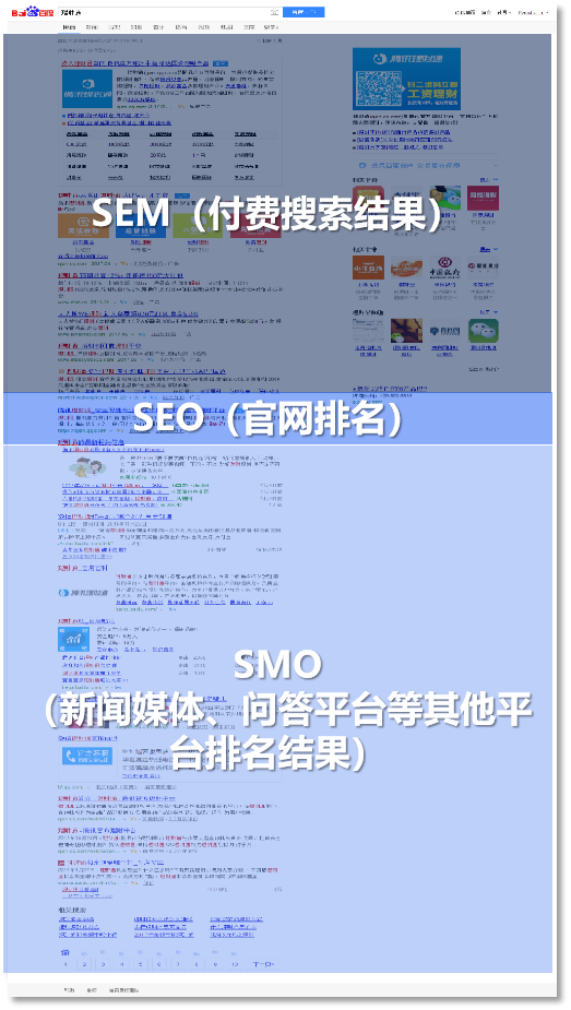 通常情况下用户在搜索引擎中查询企业时,SEM、SEO、SMO的信息呈现顺序如下图: