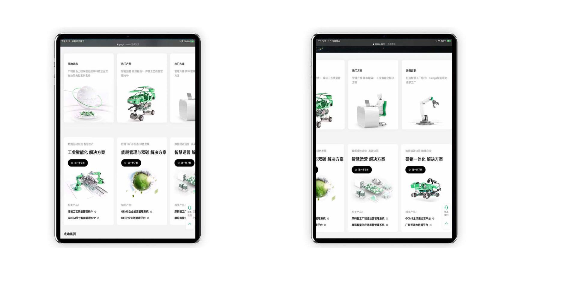 在本次改版升级重在塑造全新的互联网企业形象,首先在全站色彩布局设计上采用了“灰白绿”色,主要以绿色作为主基色,并且融合企业VI属性,形成深刻印象进而提升品牌竞争力。其次,在九游平台布局上进行了优化,网站UI设计中假如3D元素风格更加符合企业品牌定位,提升视觉冲击力外,更好地传达广域名岛品牌理念,提升品牌用户体验。最后,我们将热门产品、热门解决方案、成功案例等信息融合一体,呈现在九游平台最突出的位置上,这有利于广大受众群体快速了解到广域铭岛的实力及品牌,更有利于品牌营销宣传。